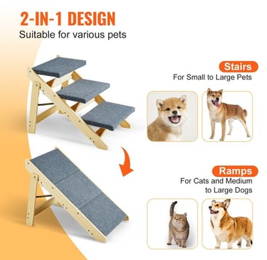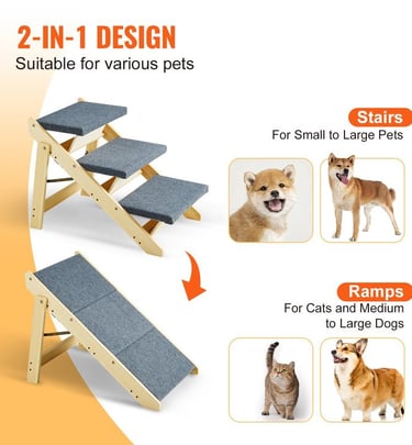 Give your dog safe, effortless access to beds, sofas, and cars while protecting their joints with this sturdy 2-in-1 wooden stairs and ramp design.