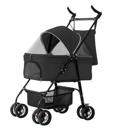 Lightweight, foldable, and stable on four wheels, this all-in-one solution ensures safe, stress-free travel for walks, vet visits, shopping, or trips.